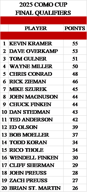 The Top 20 (and ties) point totals will qualify for the Como Cup Tournament. This tournament will be a net tournament with two flights based on the handicaps of the players that qualify.